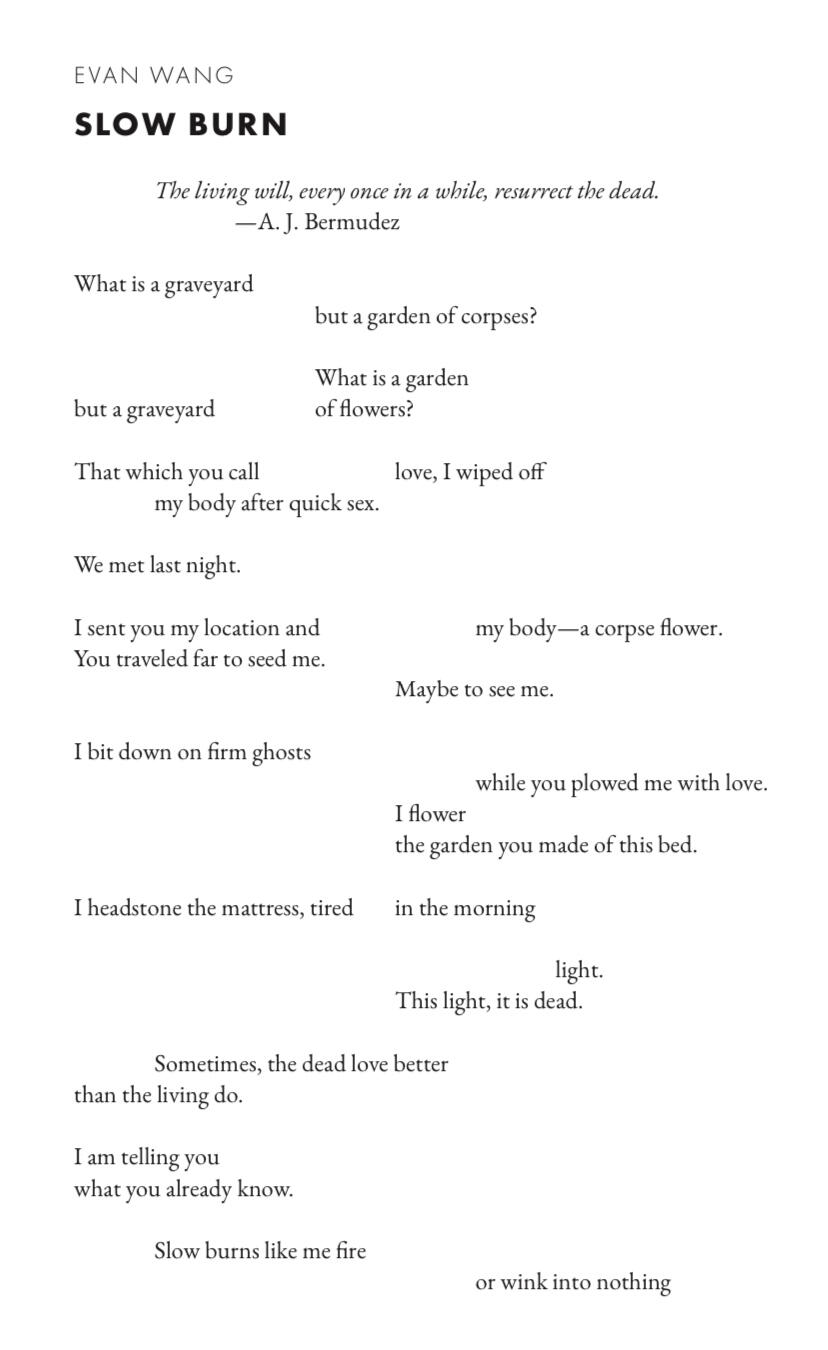 Persistent yet flickering, Slow Burn unveils a passionate world where love is both impossible and inevitable. Divided into three sections, Evan Wang’s debut chapbook traces the confrontation of the self through a cyclical journey of discovery and contradiction, ultimately leading to the choice of allowance: that which is made by the reader. These poems slowly burn first through our own inner silence, then through the thick dark of night, and finally to abstract closure—or lack thereof. They urge and hold us back, begging us to understand how, amid cultural, societal, and political suppression of the self, we kiss the muscled mouths of the world by carrying our bodies through it. Slow Burn is a romantic’s answer to the search for love, and the strangely comforting realization that the effects of the world mark us all.