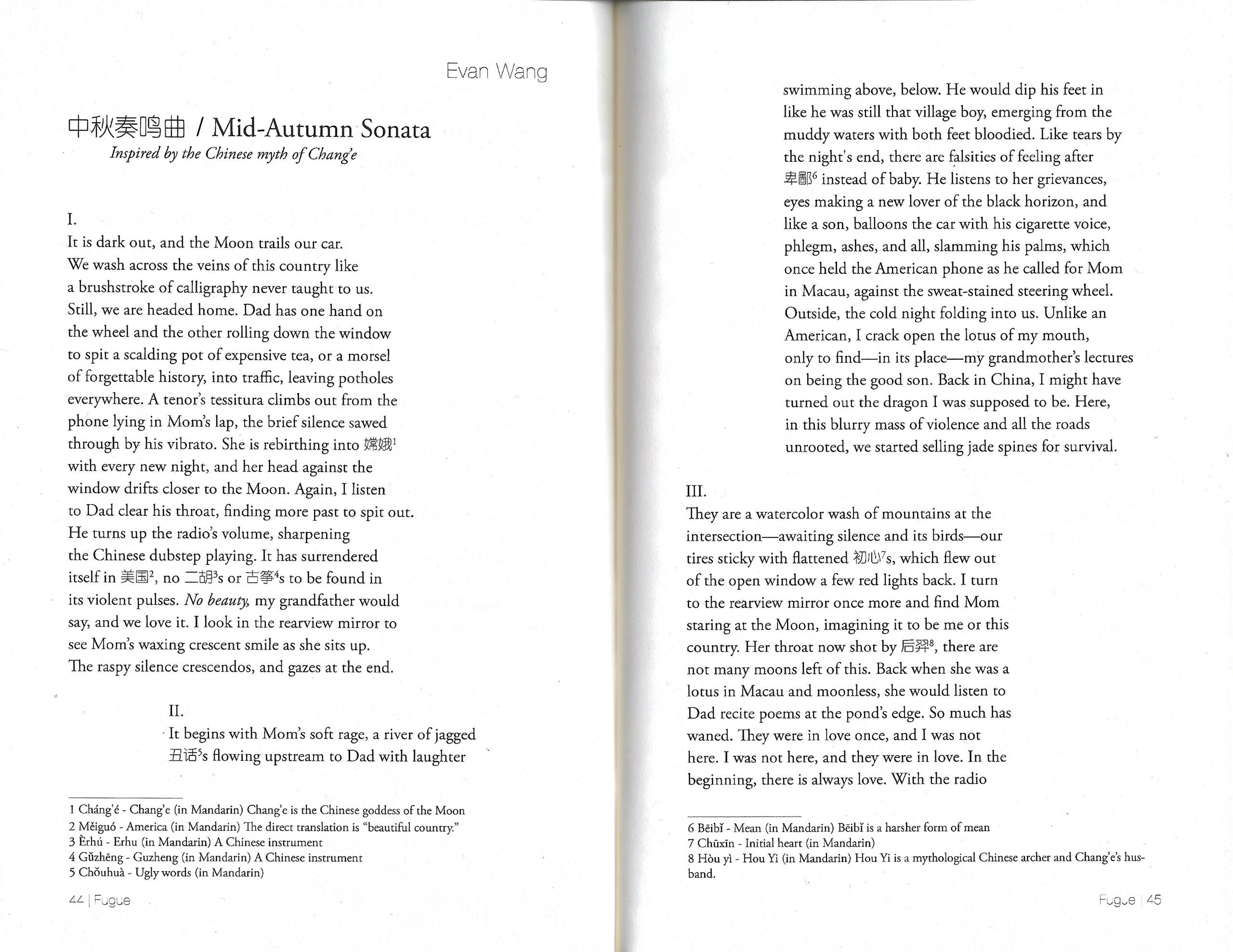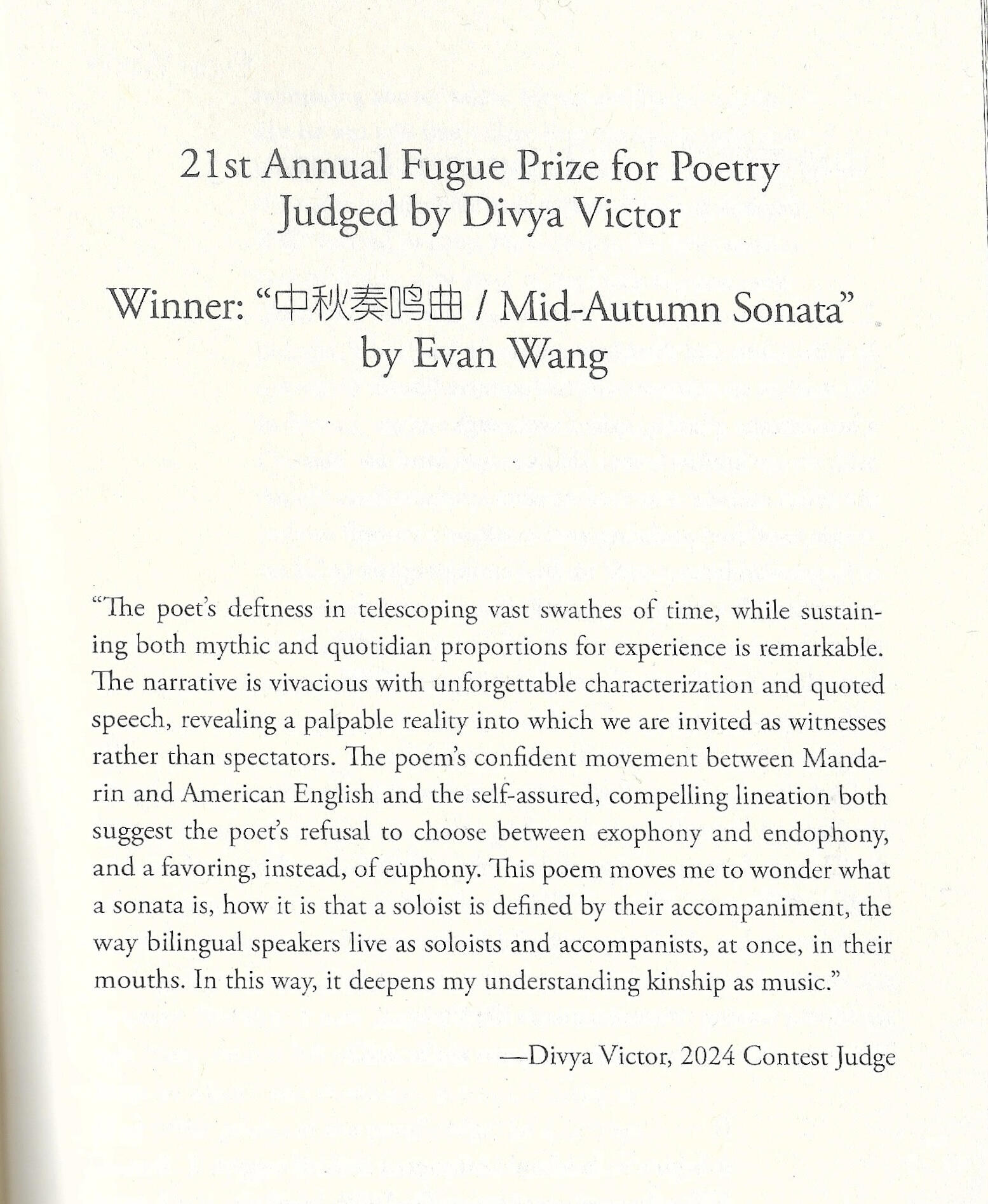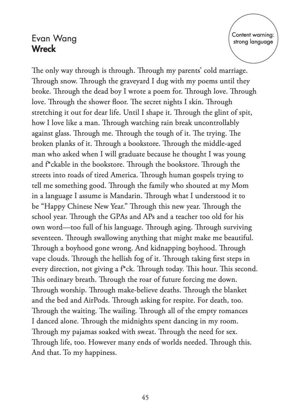 王潇/Evan Wang is the author of Slow Burn (Northwestern University Press, 2026), winner of the Drinking Gourd Chapbook Poetry Prize and finalist for the Vinyl 45 Chapbook Prize, the 2025 National Youth Poet Laureate of the United States, the 9th Northeast Regional Youth Poet Laureate of the United States, the inaugural Youth Poet Laureate of Montgomery County, Pennsylvania, and a 2025 Coca-Cola Scholar. His work appears in POETRY Magazine, The Kenyon Review, The Journal, RHINO, Sixth Finch, Waxwing, The Margins, Poet Lore, Fugue, The Harvard Advocate, and elsewhere, was exhibited at the Montgomery County Community College, and has been paired with artwork by Emmy Award-winning illustrators. He is a two-time National YoungArts Winner in poetry, a Scholastic National Gold Medalist, a commended 2024 Foyle Young Poet of the Year, the 2023 Jacklyn Potter Young Poet, and winner of the 2022 Button Poetry Short Form Poetry Contest and the 2024 Fugue Poetry Prize, selected by Divya Victor. He served as the editor-in-chief of Hominum Journal, an appointed member of the Montgomery County Commission for LGBTQIA+ Affairs, the director of the Montgomery County Youth Poet Laureate Program, and a member of the Indian Valley Arts Foundation Board of Directors, where he raised over $40,000 for arts programming. Awarded the Joyful Abundance Emerging Artist Commissioning Award, he is currently working on creating a new choral piece premiering in June 2026 by the Mendelssohn Chorus of Philadelphia at Rodeph Shalom, the oldest Ashkenazic synagogue in the Western Hemisphere. Evan is an undergraduate student at Harvard University.Evan has performed his work at various venues such as the U.S. Department of Education, the Smithsonian Institution, Roosevelt Memorial House, Oval XP, Love Park, Miami Book Fair, Kelly Writers House, Free Library of Philadelphia, Philadelphia Convention Center, the State Museum of Pennsylvania, Chinatown Friendship Arch, and The Rotunda at the University of Pennsylvania. He was a featured artist at the Our America Now: Expressions of Freedom event and the Our America Now: World Refugee Day event as part of the Wawa Welcome America festival, the largest Fourth of July celebration in the country, performing with legendary poets such as Ursula Rucker, and was invited by the White House to attend the 2024 White House Youth Policy Summit, where Evan was among 90 young people across the country invited to the White House for the first-ever interagency Youth Policy Summit: Cultivating Possibilities. Evan was also a featured artist at the YèShì Chinatown Night Market, voted fifth best cultural festival in the nation by USA Today, and welcomed over 20,000 attendees. In 2021, he was included on the Expressions of Freedom Firework Soundtrack, which played during a firework show under the Ben Franklin Bridge in Philadelphia. In 2025, Evan was celebrated at the United Nations Headquarters in New York City for the 2025 International Youth Day alongside changemakers from 84 different countries.His work has been featured at and recognized by the White House, Button Poetry, NPR, the Princeton Prize in Race Relations, WXPN, NBC10, TEDx, the Miami Book Fair, WHYY, the National Foundation for the Advancement of Artists, the Alliance for Young Artists and Writers, the National Council of Teachers of English, Pennsylvania Educator Diversity Consortium, Philadelphia Contemporary, Urban Word NYC, Pennsylvania Senate, the Free Library of Philadelphia, Columbia University Press, the Montgomery County Community College, American Educational Research Association, Gregory Djanikian Scholars in Poetry, Bennington Young Writers Awards, Susquehanna University, Gwynedd Mercy University, The Word Works, Pennsylvania Governor Josh Shapiro, Pennsylvania Council on the Arts, Senator Amanda Cappelletti, Montgomery County Commissioner Jamila H. Winder, former Montgomery County Commissioner Kenneth E. Lawrence Jr., Philadelphia Chinatown Development Corporation, Poetry4Progress, Philly Loves Poetry, The Pulitzer Center, PhillyVoice, The Mercury, The Times Herald, The Reporter, the Interlochen Arts Academy, 1455 Literary Arts, Walt Whitman Birthplace Museum, the Moonstone Arts Center, and the ruth weiss foundation.